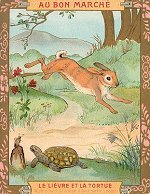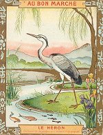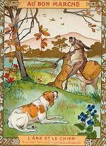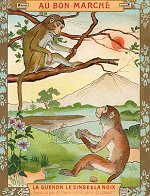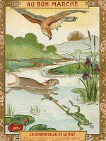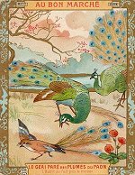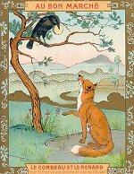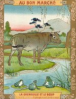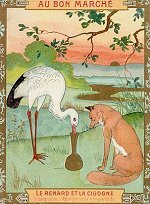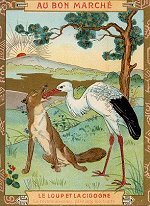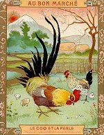 These are rich in gold with bright colors and make a strong oriental impression. The front of each, framed in gold, has "Au Bon Marché" at the top and a title and one-line moral at the bottom. On the verso we find again "Au Bon Marché" at the top, followed by a title and the verse fable of La Fontaine. At the bottom is a notice of Gossens and a printer's decoration. I have eight extras; the total number for each card, if greater than one, is indicated in the parentheses. - Date