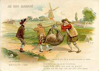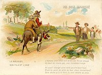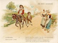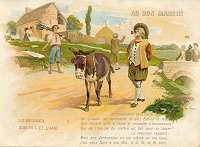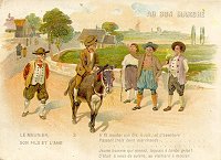 1900 Exposition Universelle 1900 "Le Meunier, Sons Fils et l'Ane." Six slightly larger than 6½" x 4½" cards printed by Courmont Frères, Ch. Rousseau Sr, Paris. Each scene signed by F. Cap (?). 70 Francs each from Annick Tilly at the Clignancourt flea market, August, '99. Extras of cards 1, 4 (cropped), and 5 (cropped) for a total of 110 Francs from Annick, August, '01. Extras of cards 1 and 3 for €2 each from Paris Postcard Exhibit, Jan., '05. Extras of cards 1 and 3 for €5 each from St. Ouen, August, '13.