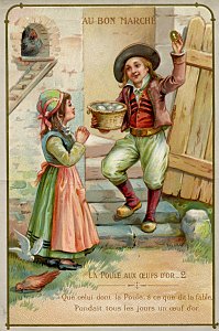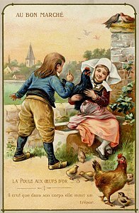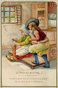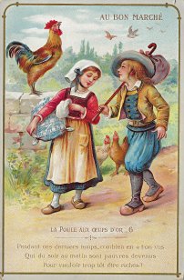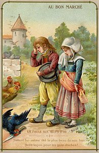 In the first image, a little girl seems to be putting coins into a stocking while a little boy watches. This seems the "before" of the story itself, establishing that the couple is poor. The second scene shows the young man delighted to have found a golden egg. The young man believes in the third scene that this black hen contains a whole treasure. The fourth card introduces the sinister knife with wondrous eagerness! In the fifth scene, the hen lies dead and the two humans grieve. Now in 2020, I have learned from Bertrand Cocq that there are actually six cards in the series. Of course! There are always six! Lovely colors! - Date