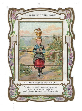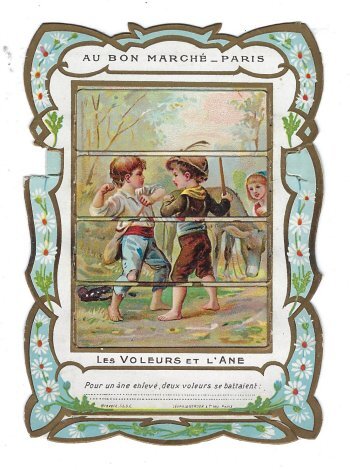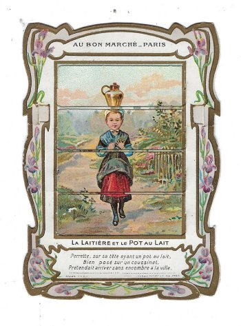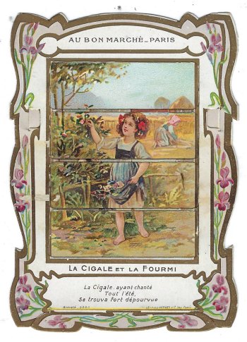 1900? Set of six mechanical Au Bon Marché La Fontaine cards, 3⅞" x 5⅞" (extended 6"). Printed by Leopold Verger, Paris. €375 for the set from French Antique Collections, July, '22. One extra set a gift of French Antique Collections, July, '22.