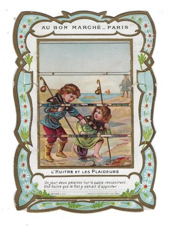 The seller offered very helpful information. This set of six comes from the collection of the great grandson of a director of Bon Marché who purchased them new so they were never issued to the public. The six cards are: 1 Le Savatier Et Le Financier; 2 Le Singe Et Le Chat; 3 Les Voleurs Et L'Ane; 4 L'Huitre Et Les Plaideurs; 5 La Cigale Et La Fourmi; 6 La Laitiere Et Le Pot Au Lait. Each card has two views, the second illustrating the moral, with an advertisement for Le Bon Marché on the reverse. - Date
