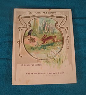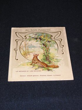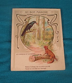 I am delighted to learn that there is a set of popups by BM. I had thought that their FG was a one-off. This FC is another exquisite pop-up in very good condition. The front card is cut on the lower 75% of the circle enclosing the upper portion of the picture, so that a viewer discovers that the front page opens up. When it does, he or she sees a three-dimensional scene. In the background is the name of Au Bon Marché. In the middle ground is a group of four smiling cooks. In the foreground is a distinguished looking speaker in front of a table. Is he flattering them? At any rate the couplet beneath the picture contains La Fontaine's warning that every flatterer lives from the person who listens to him. To see how the pop-up works, click on it. -