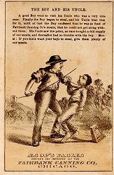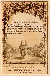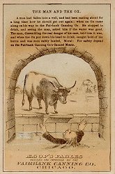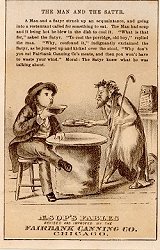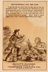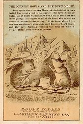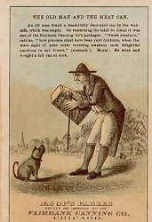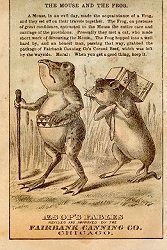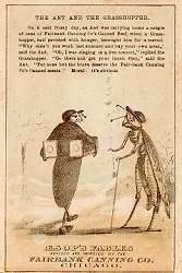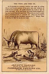 Aesop's Fables Revised and Improved by the Fairbank Canning Co, Chicago. Thirteen cards, perhaps the complete set, each transforming an Aesop's fable into an advertisement for Fairbank canned meat. Though the size varies slightly, they are generally 3¼" x 5". Three were a gift of Eleanor R. Webster of Retired Books, Sherborn, MA, August, '91. Others came for various prices from $2.50 to $23.63 from Jane Choras through Payson Hall Bookshop, Belmont, MA, August, '91; Dave Anderson, Monson, MA, through Ebay, March, '99; Jane Davidson, West Yarmouth, MA, through Ebay, April, '00; Dave Cheadle, Englewood, CO, Sept., '99; $35; James Becker, Walden, NY, through Ebay, Feb., '01; Robert Moore, Haverhill, MA, through Ebay, June, '01, Primarily Paper, through eBay, May, '03, Lynne Van Brocklin, Norcross, GA, through eBay, Sept., '03, and Barton Kamp, Worcester, MA, through eBay, Sept., '08. I have extras of most of the cards.