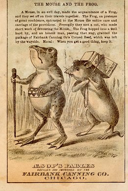 - "The Mouse and the Frog" usually has a passing kite seize both the frog and the mouse who was tied to the frog. Here the frog leads the trusting mouse towards his home, while the latter shoulders a can of Fairbank corned beef. When a cat passes by and eats the mouse, the frog drops the can and jumps into a well. A passing man grabs the meat left by the wayside. Moral: "When you get a good thing, keep it."
