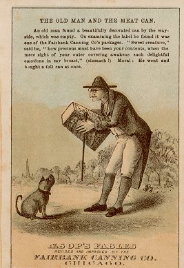 - "The Old Man and the Meat Can" may be one of Fairbank's more outrageous "stretches" of an Aesopic fable. It is based on the fable of the old woman who finds an empty wine jug. Here the old man finds an empty Fairbank meat can on the roadside. Here is what the card then presents: "'Sweet creature,' said he, 'how precious must have been your contents when the mere sight of your outer covering awakens such delightful emotions in my breast,' (stomach!) Moral: He went and bought a full can at once."