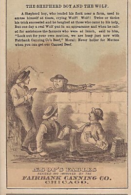 - BW is a card poorly cropped by the printer: some of the next card down shows through, and the top margin is not complete here. For that reason, I have been happy to find a better copy and to present it below the original for comparison. In this version, the boy as usual cries "Wolf!" and means it after tricking people several times. They answer "Look out for your own mutton, we are busy just now with Fairbank Canning Co's Beef." "Moral: Never holler for Mutton when you can get our Canned Beef." This card, which may complete the set, came with a number of others from Betsy Cotter, Tonawanda, NY, through eBay, Feb., '12. Better copy for $5.95 from Jacqueline Luzusky, Pinehurst, NC, through Ebay, March, '20