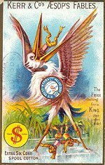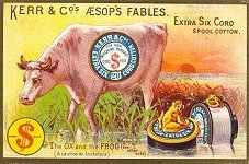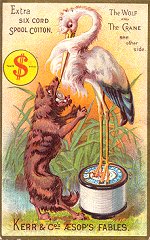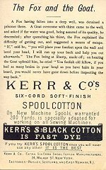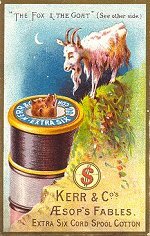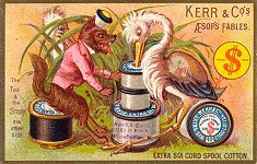 1880? Aesop's Fables. Seven unnumbered 5" x 3¼" cards, including one extra, from a larger set with colored illustrations. NY: Kerr & Co. Extra Six-Cord Spool Cotton Manufacturers. $16 (WC) and $12.50 (Fox and Goat) from John Davan through Ebay, Feb., '99 and $15 (WC) from Chuck Norris through Ebay, March, '99. FS for $21.75 from Carolyn Dias, Hanson, MA, Jan., '00, and OF for $22.60 from her in Jan., '01. FK for $32.50 from Linda Winkens at Relics, Sturgis, MI, through Ebay, Feb., '00. 2P for $13.52 from Linda Chromik, North East, PA, through Ebay, Dec., '00. Extra copies of WC, 2P, OF, and FS for $11.53 from Kathy Elliott, Ruskin, FL, through eBay, March, '08.Extra copy of OF from Susan Carlson, Dec., '24.