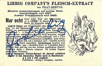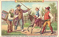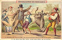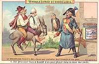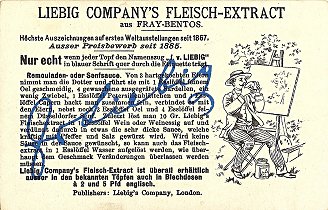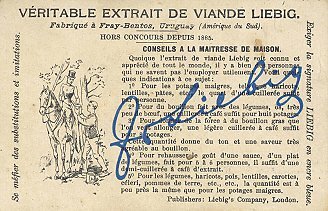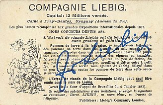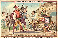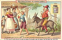1892 Die Bauern und der Esel. Liebig Company's Fleisch-Extract. Six numbered cards. $49.95 from Kyle DeRoy, Denver, through eBay, Oct., '06. - See also the second MSA set (II) from Liebig in 1924. The backs of cards 3 and 4 here have a slightly different format with "COMPANIE LIEBIG" in large capitals at the top, while the other four cards have "VÉRITABLE EXTRAIT DE VIANDE LIEBIG" in smaller caps at their tops. See below the verso of cards #1 and #3 as samples. The fable here is presented not in La Fontaine's fashion, as it is in the 1924 set, but in the more traditional fashion, where first both walk, then each rides, and then both ride. Each card's number, below the picture, also has a sentence describing the scene or emanating from one of its players. The surprising card here is #5, where the men support the front legs of the ass. Then in #6 they carry him on a pole, and the scene's sentence says ""Le plus âne des trois n'est pas celui qu'on pense." The moral throughout is "On ne peut contenter tout le monde et son père." The cartoon figures here are the kind that people from Milwaukee see on the walls of their German restaurants. The miller smokes a German pipe throughout. The artist is of course ingenious in positioning a container of Liebig's meat product somewhere in each scene. Now, eight years later, I am happy to have found the German set too. The only difference I notice among the versos of these German cards lies in the degree of bolding given to the top line. These cards are so lovely that I reproduce each in larger-than-life dimensions. Click on a small version to see it.