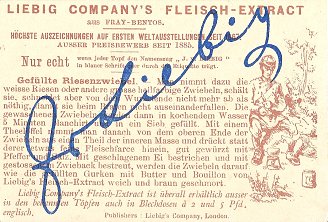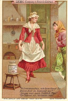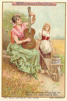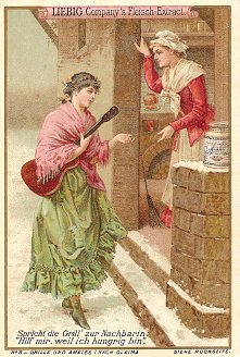 Each scene puts a can or jar of Liebig's meat product in one of the lower corners. The last two cards I had already found advertising Aux Deux Passages in Lyon. As I comment there, I have never before seen the ant dance, supposedly in mockery of the cicada, as the former sends away the latter. - Date