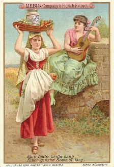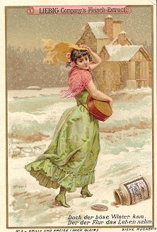 1892 Grille und Ameise (Nach Gleim). Liebig Company's Fleisch Extract. Six numbered cards, each with two to four lines of rhyming German verse on the picture. Lie0625. $49.95 from Kyle DeRoy, Denver, CO, through eBay, Oct., '06