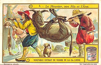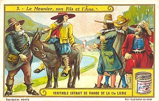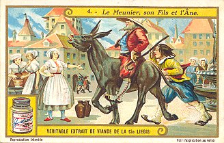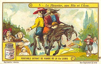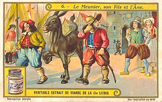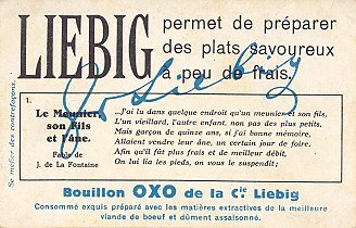 1924 Le Meunier, son Fils et l'Âne II. Compagnie Liebig. Six numbered cards, each with a section of La Fontaine's French text on its verso. Sanguinetti #1158. $15.50 from Dany Wolfs, Roeselare, Belgium, Feb., '00. Extra copy for £10 at Murray Cards International, Cecil Court, London, May, '97.