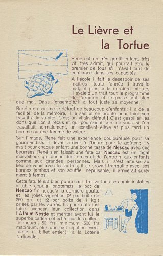 - Young René has developed a pattern. He works poorly all year long, but then races through his work at the end. One day he pays for this fault. His classmates have all been invited to a cup of Nescao with buttered bread. René, sure that he can get there quickly, arrives late. Every drop of that delicious Nescao has been consumed! In the picture we see René just entering through the drapes at the upper right. The other children are not only enjoying the Nescao; they have also found the "vignettes," stickers to put into their Nestle albums, so that they can get 50 Francs for completing an album – and have a chance besides at a ticket in the National Lottery!