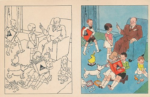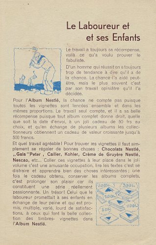 Here the family father is advising his children to fill in their Nestlé albums: that is productive work! The verso then reminds us of the story of the laborer who entices his children – albeit after his death – to dig into the family farm. Work, not luck, brings success. As far as I am aware, Europeans more than Americans provided children with advertising albums into which to paste small stamps. This collection has several such promoted by Menier chocolate candy. The verso moralizes that there is no luck involved in assembling a Nestlé album, and work will bring a reward of 50 Francs for a completed album!