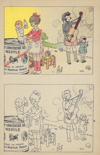 There are two mothers. One is hard working, always prepared, and makes sure that her child drinks lots of Nestlé sugared milk. The other is opposite and has to beg for Nestlé sugared milk from the first mother. Apparently she does not get it. The first mother is so careful that she can save money by putting together cards like this into a Nestlé album!