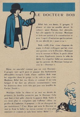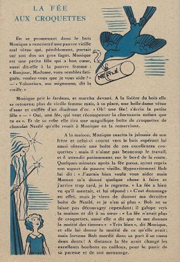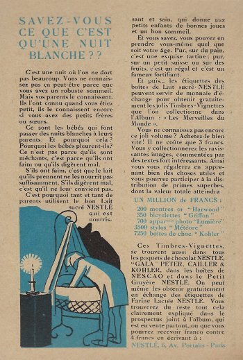 Here is a third set of Nestlé trade cards. I present first a verso. There are eight different versions, three of them duplicated. Those duplicates are, roughly, “Did you work hard this week?” and “He’s really hungry!” and “Do you know what a white night is?” (A white night is a sleepless night, caused of course by a child hungry or struggling with digestion. Solution? Something by Nestlé!) Each includes a stipulation of the prizes in Nestlé’s contest. Apparently many Nestlé products suitable for children contained “stamp-vignettes” which children collected in an album “Wonders of the World.” Prizes for filling an album included 200 “Harwood” gold watches and 350 “Griffon” bicycles. - Date