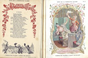 This book is a curiosity. It is made up principally of the 24 cards published and distributed by Phosphatine Falières and printed by Devambez in Paris.. It adds to the cards a leather set of covers, a title-page, a frontispiece of Florian, and -- at the back of the book -- a T of C. It has further a page before the frontispiece to be filled in with the name of the recipient: "Offert a M…par la Maison Chassaing." "Maison Chassaing" sent me on a merry chase on the web. I come away thinking that there are associations here with fine dining and particularly wedding feasts, but that is only an impression. The surprising thing for me is that this "book" is not a homemade album of the complete set but a "professional gift" made up by Falières and given away by a more local entrepreneur. The good news for our collection is that the book brings together into a full set individual items otherwise found in distinct groupings. Compare the home-made album, for which I paid about five times as much! - Date