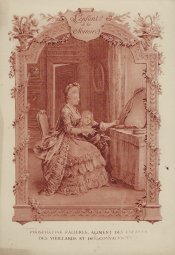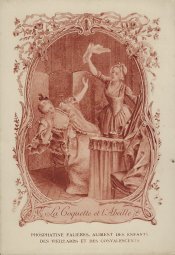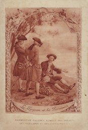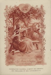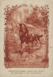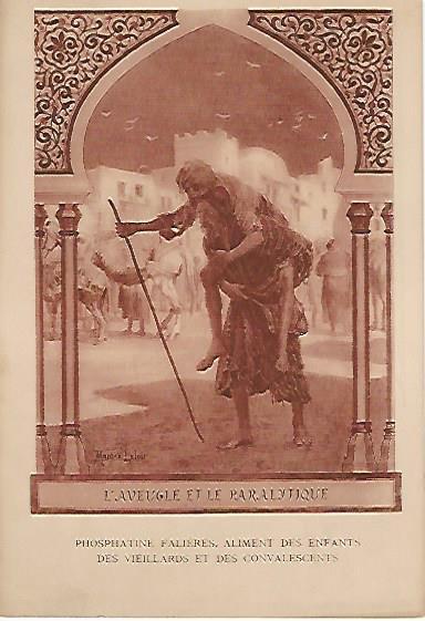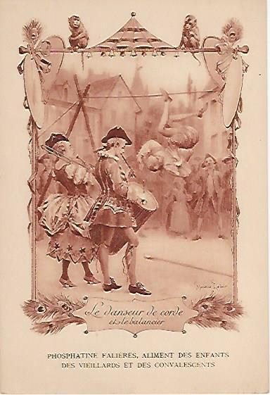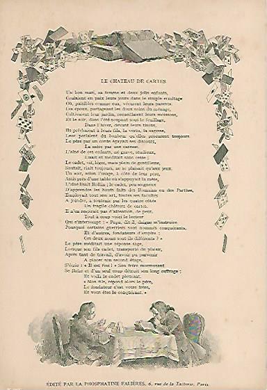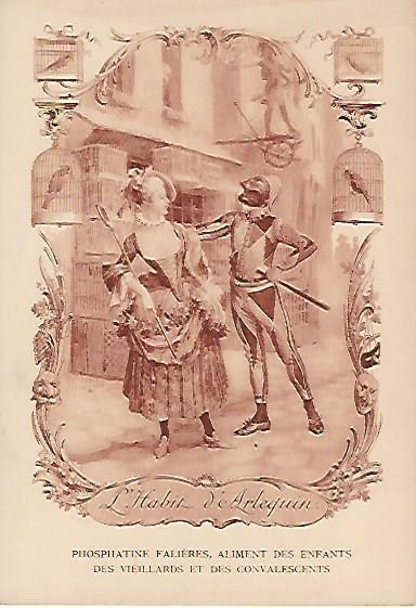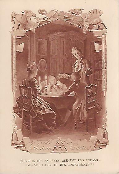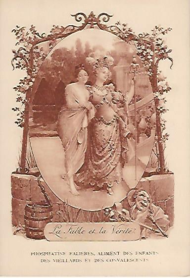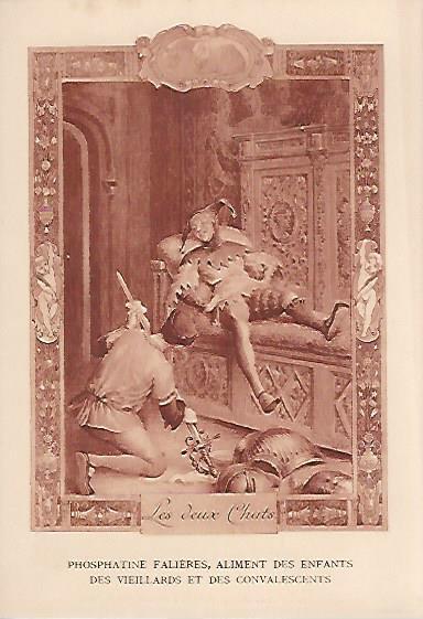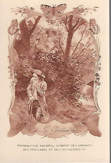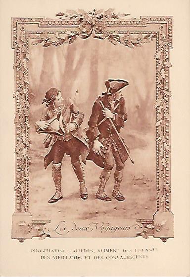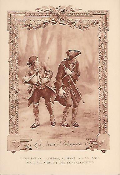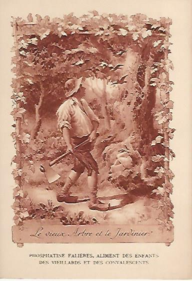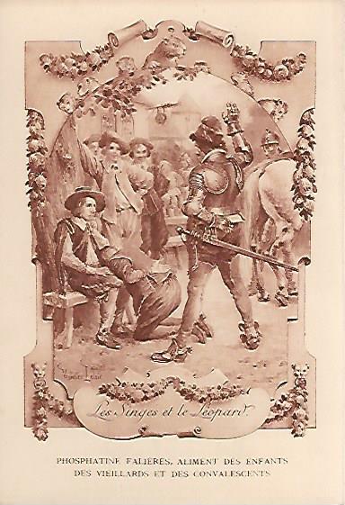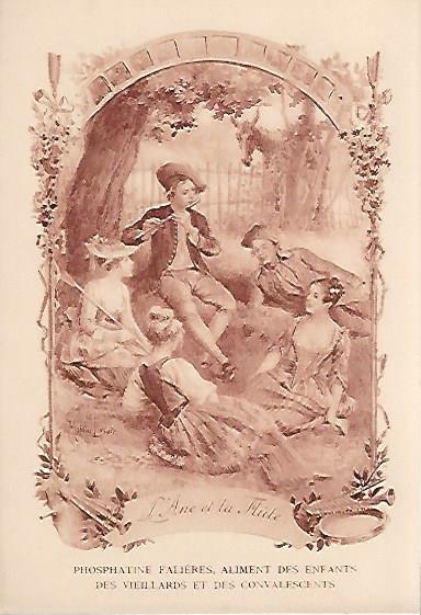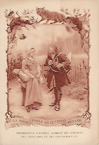 1910? Twelve 7½" x 5¼" cards engraved by Devambez in Paris, picturing and presenting Florian's fables but not in full color, as in an otherwise almost identical set, but rather in monochrome. "Édité par la Phosphatine Falières." Gift of Bertrand Cocq, Calonne-Ricouart, France, August, '15. Now six further cards for $6 each from Bertrand, Sept., '21.
