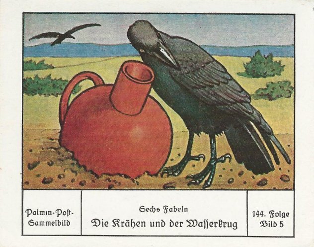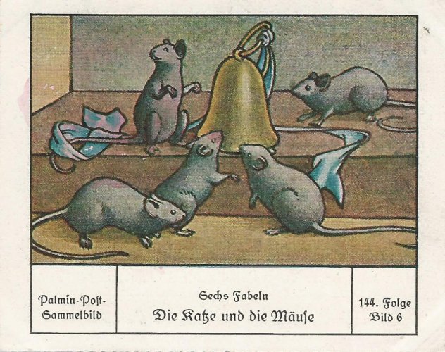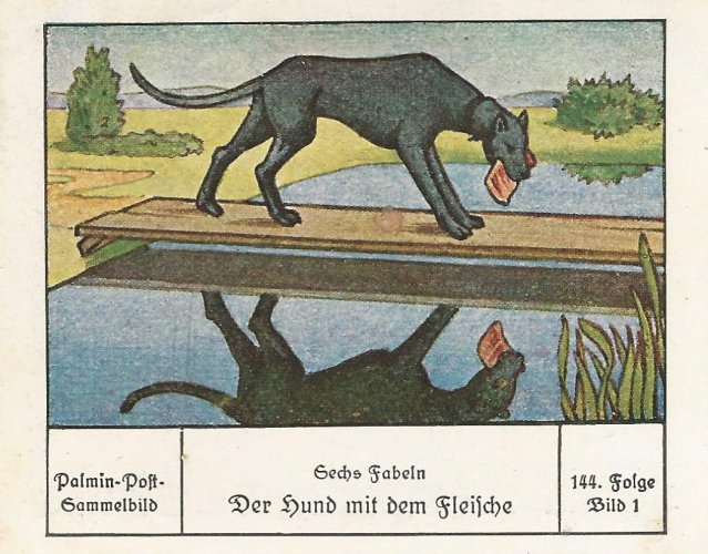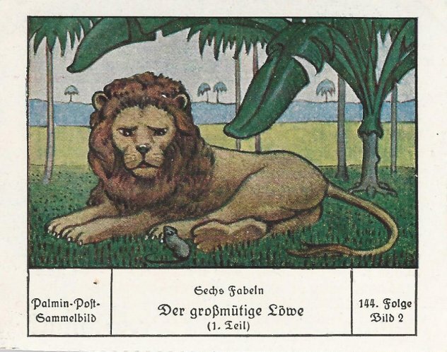 These four cards are in quite a different style from Palmin's other set. DS, LM, CP, BC. I am guessing that the cards show an art deco style. The German text is all in Gothic letters favored in the twentieth century up to 1945. The edges are rough cut and may have been part of a larger page. The verso has a prose fable text with no indication of a fabulist or visual artist or card printer. - Date