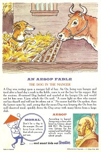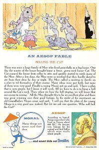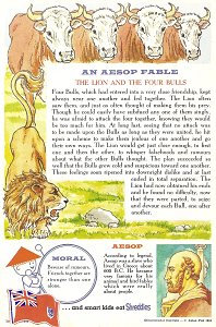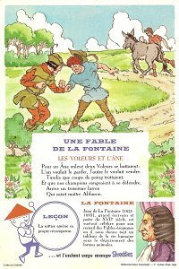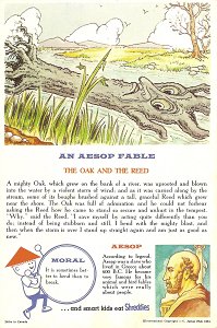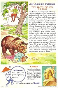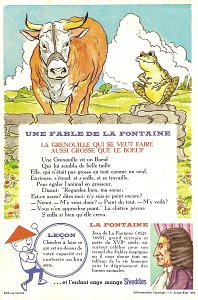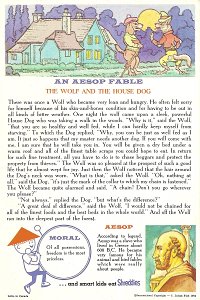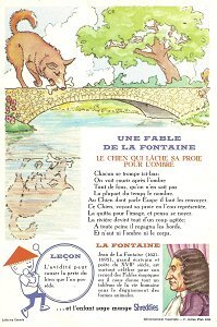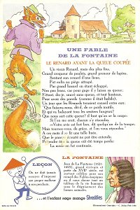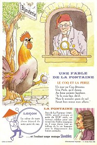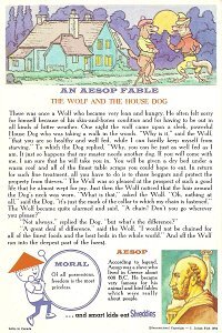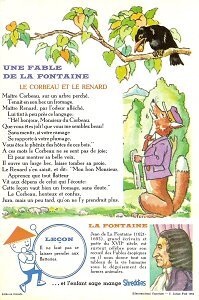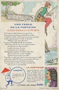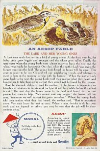 1964 Seven cards displaying each an Aesop fable on one side and a La Fontaine fable on the obverse. Shreddies. Litho in Canada. ©C. Julian Fish 1964. 4" x 6". Six cards for $27.95 from Melodee Faith, Nanaimo, BC, Canada, through eBay, Feb., '09. Six more cards, including two of "The Lark and Her Young Ones" with ""Let Petit Poisson et le Pêcheur" for $39.20 from Simon Bourque, Quebec, through Ebay, May, '20.