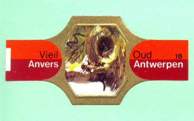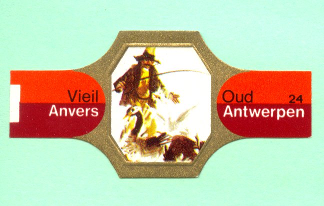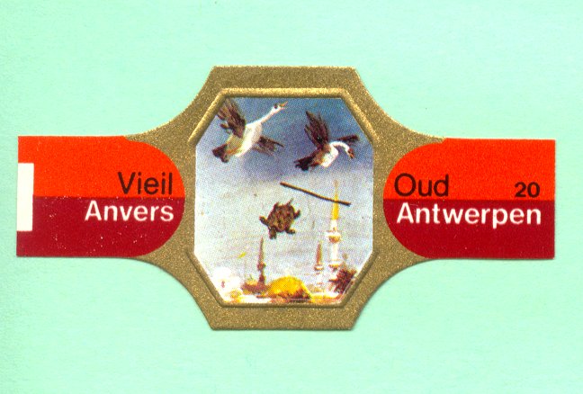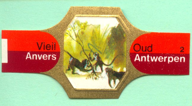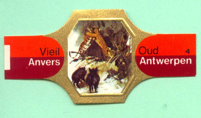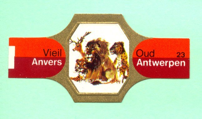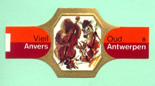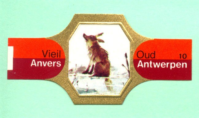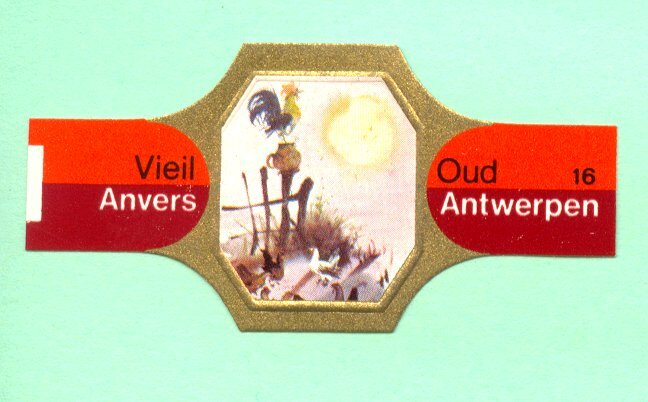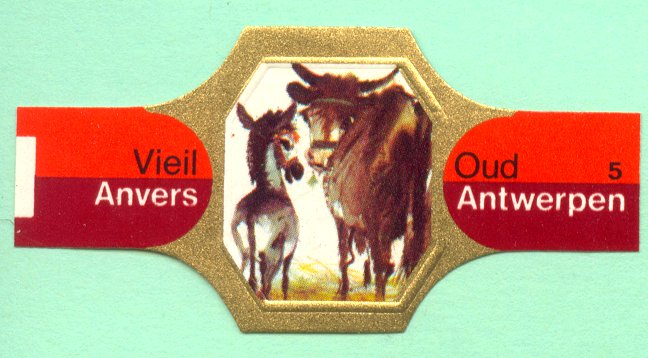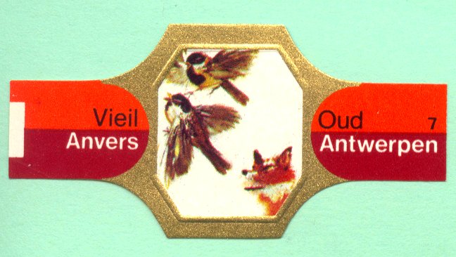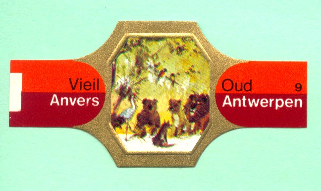 1960? Complete set of 24 paper cigar bands from Verellen, Vieille Anvers in mint condition. 1 3/16" x 7/8". The bands are two shades of red, and frames for the colored illustrations are gold. The subjects are animal stories including fables. $18.55 from Andre Prenger at The Holland America Cigar Band and Label Store, Amsterdam, through Ebay, July, '99.