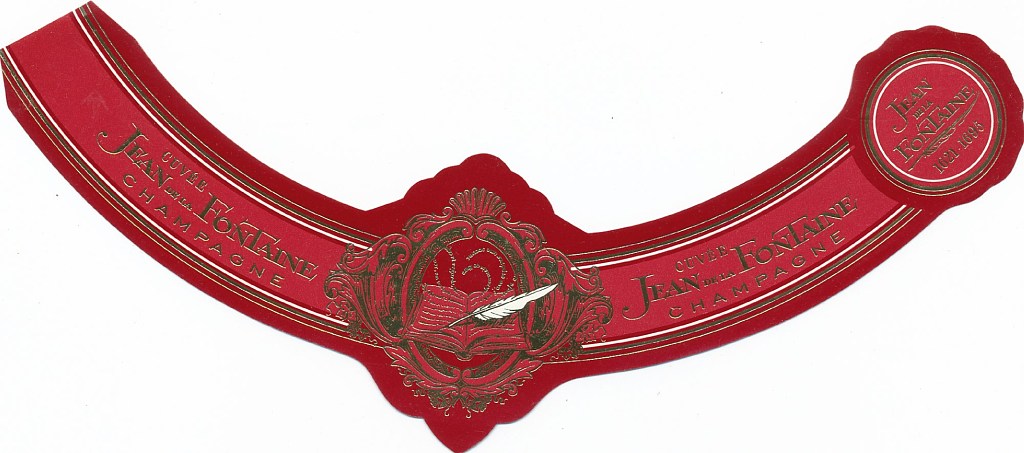 1950? "Jean de La Fontaine" champagne label. "Cuvee Champagne Jean de La fontaine, 1621-1695." $5 from Bertrand Cocq, Calonne Ricouart, France, Sept., '18.