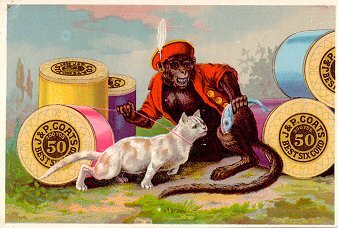 As in the 1881 card copyrighted by Auchincloss, a monkey restrains a cat by means of a Coats thread while he holds a fish before the cat's face. On the back of this card, by contrast with that, is an advertisement for J. & P. Coats which starts "We will not weary you with statistics…." Statistics made up the whole back of the other card! A dealer has noted on the back of the card that it is pictured in Cheadle, Victorian Trade Cards (and now, three weeks later, I cannot find it there!). -