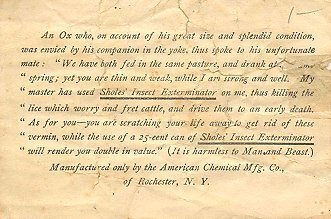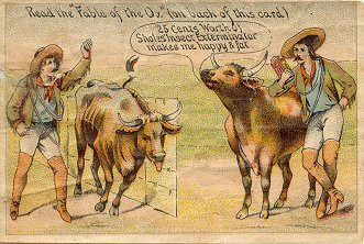 1880? One card advertising Sholes' Insect Exterminator by means of the "Fable of the Ox" on the back of a card; the front of the card tells us to read it. The colored picture shows an emaciated and exhausted ox next to a healthy one who proclaims "25 Cents Worth of Sholes' Insect Exterminator makes me happy and fat." 3" x 4½". $1 either in Sacramento, Dec., '96, or Foster City, Feb., '97.