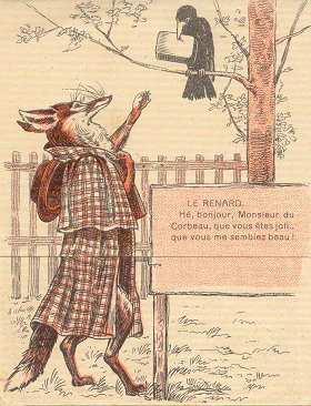 This is a delightful, well-preserved card. The folded view is a traditional one of FC. Open the fold and you will find that the crow has not a cheese in his claw but a box of Poncelet cough drops. "I let go of the cheese the other day, but I am hanging on to my Poncelet cough drops!" The well-dressed fox weeps. This piece of ephemera has lasted wonderfully for almost one hundred years! - Date