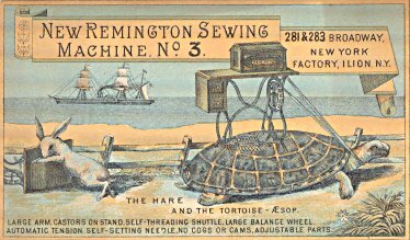 The tortoise is carrying the Remington sewing machine on its back. It is hard for me to tell what the hare is doing! The card lists both a Broadway address in New York City and a factory in Ilion, NY. The verso has a stamped message from J. Ernest Hammond, Bauneg-Beg, Maine. The message invites, in part, the submittal of "names and addresses of 20 ladies that you believe would be interested in our goods or act as agents, and The Monitor will be sent you 6 months free." We also read "Ladies desiring to make money easily should send for wholesale lists" of items like sewing machine needles, spooler rubbers, and bobbins. -