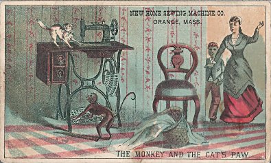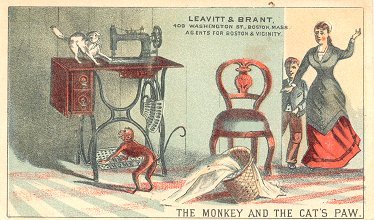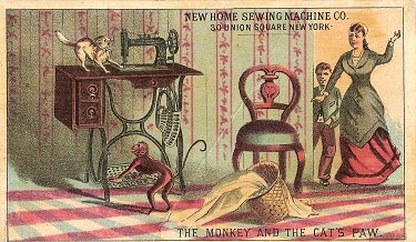 1885? One three-color card advertising the New Home sewing machine available at Leavitt & Brant in Boston. 3" x 5". The card is titled "The Monkey and the Cat's Paw." $3.50 at Foster City, Feb., '97. One extra copy advertising L. W. Thompson, Cherry Valley, NY.