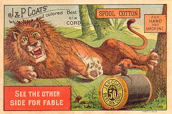 This is one of the most dramatic trade cards I have. The lion is bound up with threads, and the mouse sits perched on a spool of J. & P. Coats Best Six Cord thread. The other side of the card gives the fable and a long application, both apparently taken verbatim from Croxall. The card's picture is in a style different from all other Coats cards I have found, especially when it inserts three colored boxes to give information: "Spool cotton," "For hand and machine," and "See the other side for fable." -