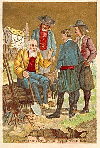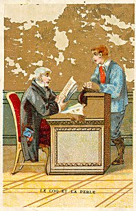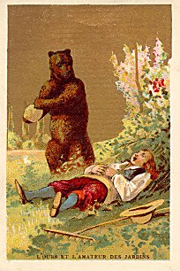 These five cards all have a gold background, whether sky or wall in the individual scene. On CJ the gold has deteriorated. Two (CJ and TB) have a stamp on the picture advertising Chocolat Poulain (see my Chocolat Poulain Orange cards). The images belong to a series that appear in this collection in several places: Maison Salmon, Alcide Picard, and Verger-Haquet. The most animated and engaging of the scenes here may be that of the mother stealing her child away from the wolf, while the father prepares to shoot the animal. The backs of these cards are quite varied. TB and CJ are again alike in presenting only the fable's text, though in different formatting. TB's formatting fits with that of " L'Ours et l'Amateur des Jardin," and here again only the fable's text is offered. "Le Vieillard et les trois jeunes Hommes" has a blank verso. "Le Loup, la Mère et l'Enfant" presents a page of advertising for J. Vigreux, a hosiery dealer in Amiens. The fables in this series thus include: - Date