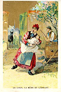1890? 5 colored French cards, with golden sky and block letters, picturing scenes from La Fontaine's fables. Just under 2¾" x just under 4". One card ("Le Loup, la Mère et l'Enfant") was printed by "Alph. Barbotte, 23, rue de Cherche-Midi, Paris." For an average of 50 Francs each from Bertrand Cocq, Calonne-Ricouart, France, March, '01, and Annick Tilly, Clignancourt, August, '01.