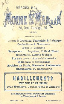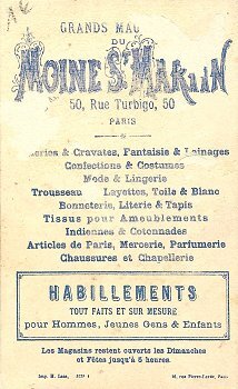 I am surprised to find another card in the series. It is ¼" higher and less than ⅛" wider than the "Beef-Lavoix" card but belongs clearly to the same story and approach. Here the maid's pail has fallen, and she is crying. According to the verso, Moine St. Martin in Paris sells all sorts of clothing and many other things. And the store stays open on Sunday until 5 pm! What a lucky find! - Date