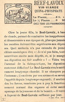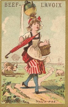 1890? One colored French MM card advertising "Beef-LaVoix, Vin-Viande, Quina-Phosphate." (Are those three different things?) The image is marked "Faux Pas." Printed by H. Laas, Paris. 2½" x 3⅞". 50 Francs from Annick Tilly at the Clignancourt flea market, August, '99.