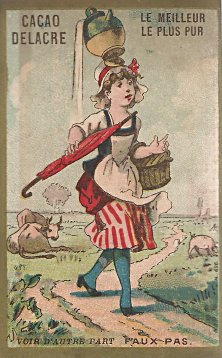 1890? One colored French MM card advertising "Cacao Delacre." The image is marked "Faux Pas." Printed by H. Laas, Paris. 2½" x 3⅞". €1 at St. Ouen, August, '15.