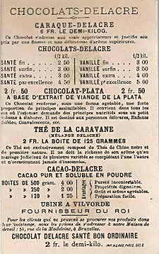 The image is the same as on my "Beef-LaVoix" card. The verso lays out various sizes and prices of Delacre's cocoa and chocolate. -