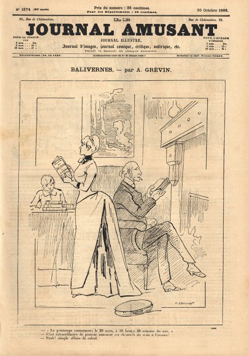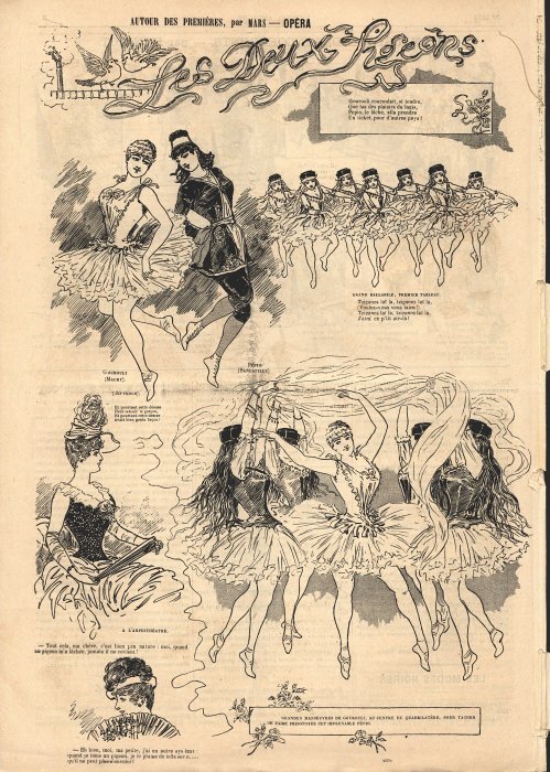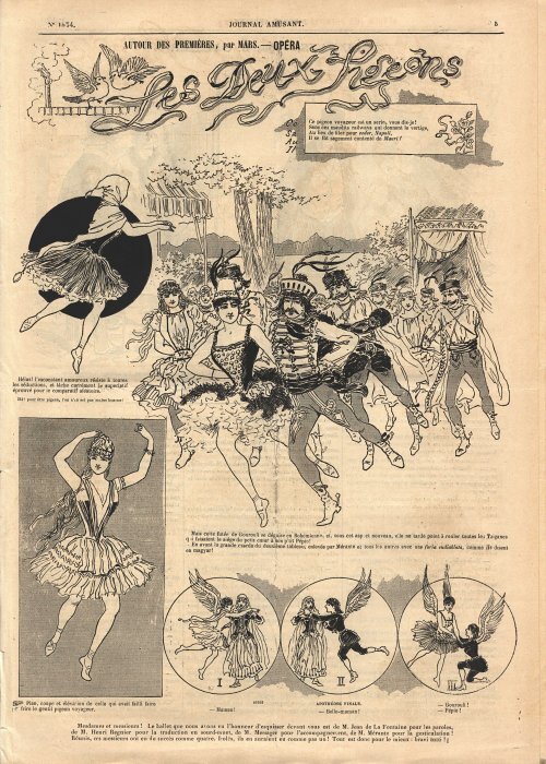 1886 Article presenting the La Fontaine opera "Les Deux Pigeons." Pages 4-5 of "Journal Amusant," October 30, 1886. €10 at Clignancourt, July, '19.