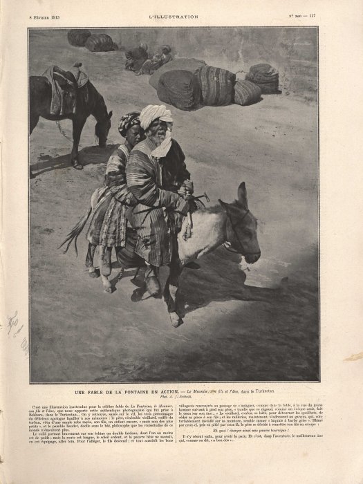 1913 "L'Illustration" magazine for February 8, 1913, includes a full-page insert (page 117) as it reports on elements of, I believe, the "Balkan Wars." The full-page insert offers a photograph of a mule and two riders in Turkestan who illustrate MSA. The caption retells the fable. €12 from journauxanciens through Ebay, Feb., '