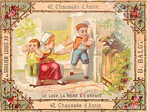 The pink and floral border frames each of two scenes familiar already from cards marked by "Dépot Central," namely "Le Loup, la Mère & l'Enfant" and MSA. These cards are thus slightly larger than their "Dépot Central" counterparts. Once again, the color printing is not exact. Baloy is a shoe dealer. The "Le Loup, la Mère & l'Enfant" card shows some old paste scars on both faces, while the MSA card shows them only on the text side. -