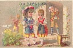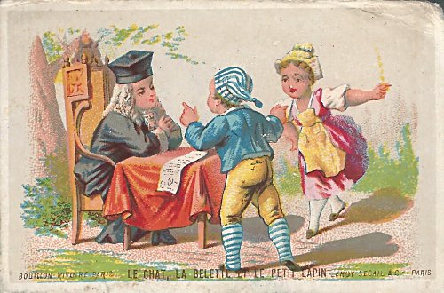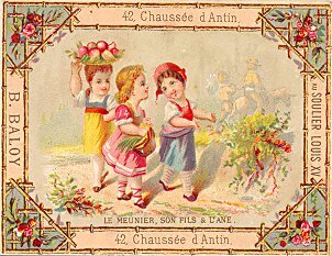 Two groups of cards seem to make use of the same plates employed for cards I have listed under "Dépot Central." All of them acknowledge Bouillon, Rivoyre and Company as their printer, and all feature children acting out La Fontaine's fables. 1890? 2 cards with full-color images of children acting out La Fontaine's fables within a border advertising B. Baloy, 42, Rue de la Chaussée d'Antin. 3" x just over 4". 50 Francs each from Annick Tilly at Clignancourt, August, '01.