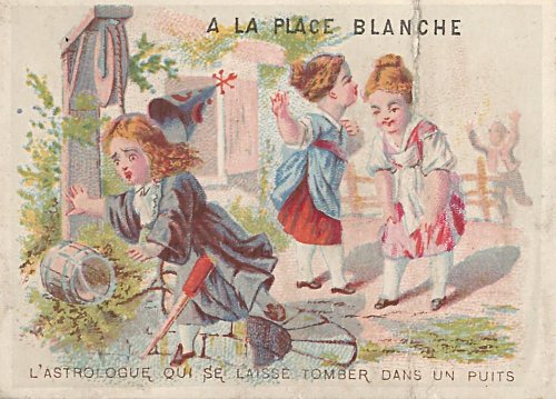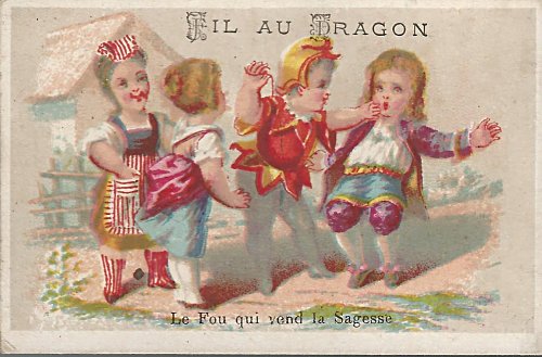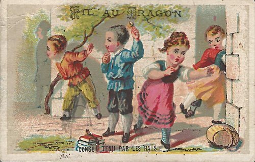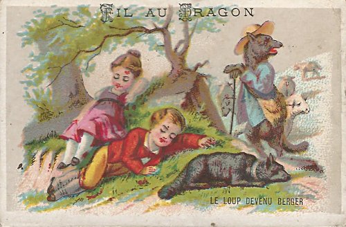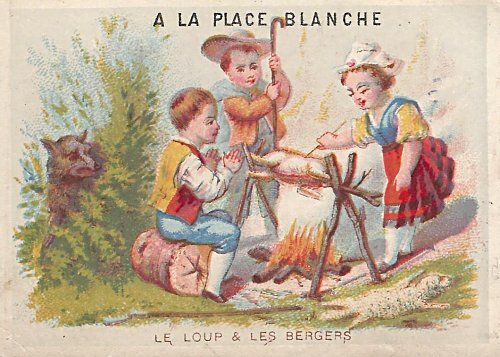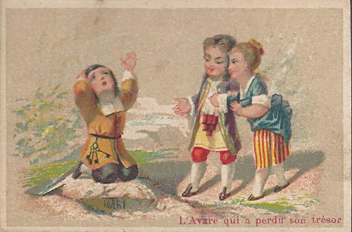 1890? 8 cards with full-color images of children acting out La Fontaine's fables. Just over 2½" x 3½". Several from Annick Tilly at Clignancourt, August, '01. Two duplicates. Extra of "The Fool Who Sells Wisdom" advertising "A Saint Roch," for $5 from Bertrand Cocq, Calonne Ricouart, France, Sept., '20. "Gardener and Master" for €5 from Simon Rodrigues, through Ebay, June, '22.