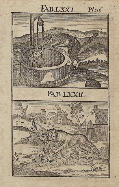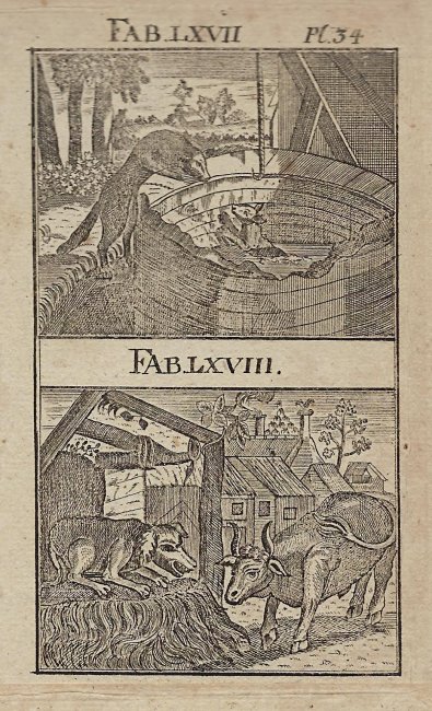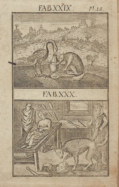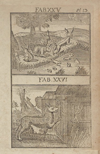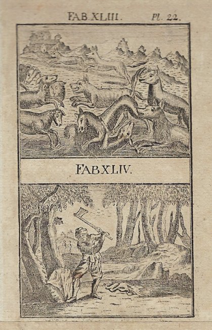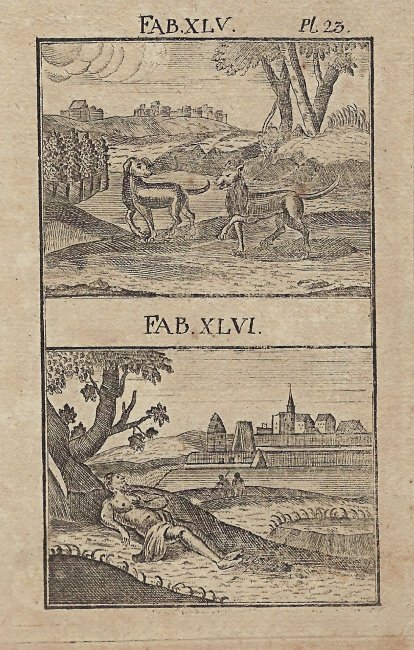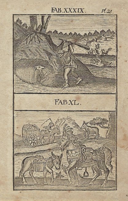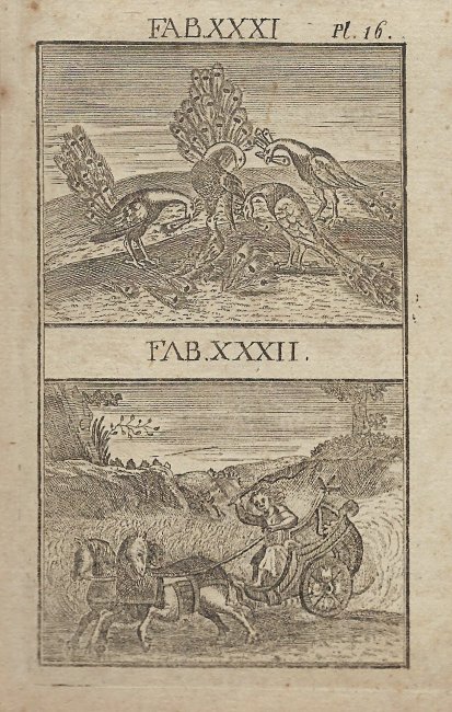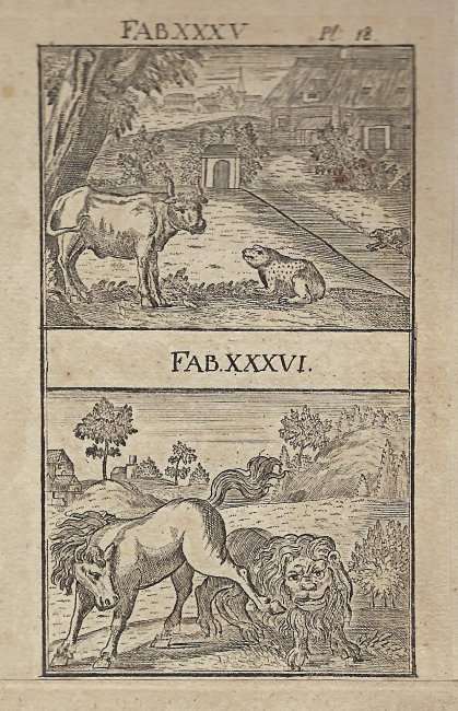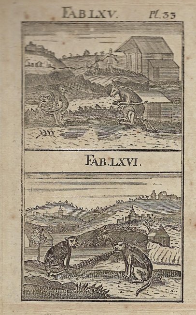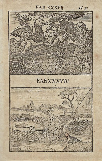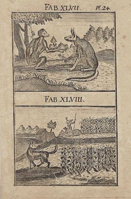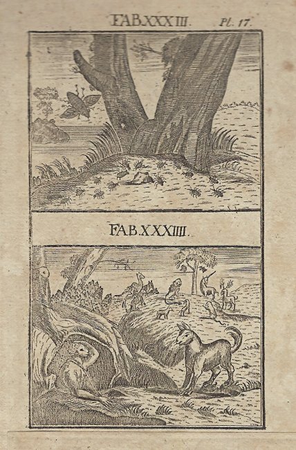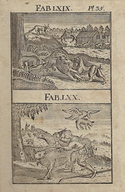 1750? Four broadsides of eight illustrations each by Georg Paul Busch from his 117 illustrations for the edition by Abbé Jean-Baptiste Morvan de Bellegarde (Amsterdam 1708). €60 from Antiquariat Kitzinger, Munich, July, '19.
