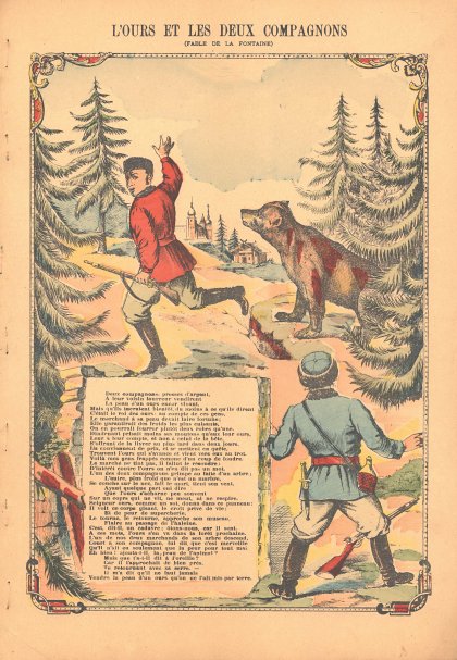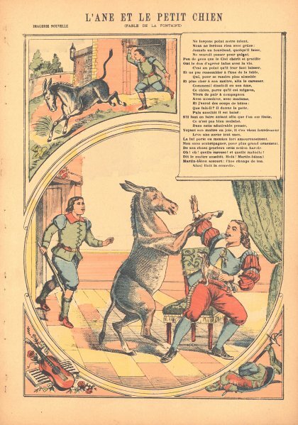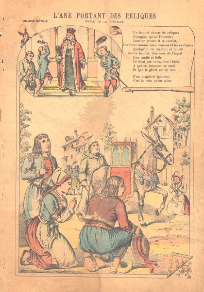 1900? Three broadsides from Imagerie Nouvelle, presenting TB; "The Ass and Lapdog"; and "The Ass Carrying Relics." €9.90 each from bdsetrevuessympas through Ebay, Feb., '23.