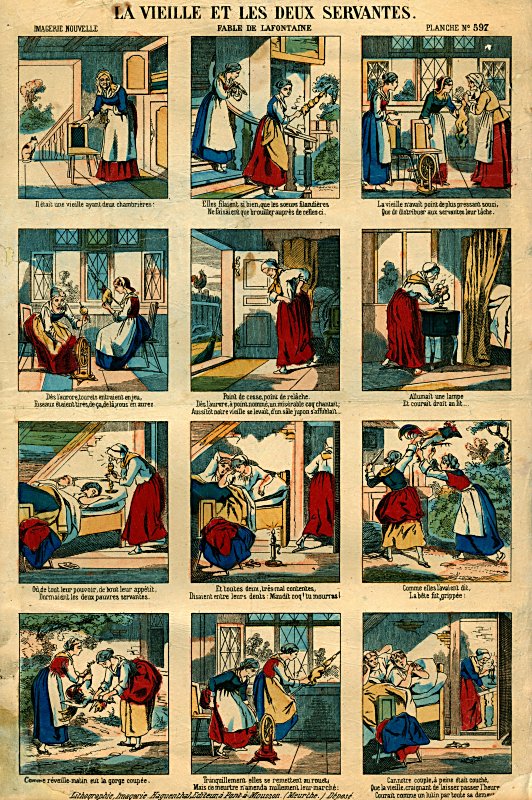 This broadside features a fable by Jean de la Fontaine titled “La Vielle et les Deux Servantes.” The poster has twelve scenes drawn out in ink and then printed on the paper along with captions describing the images. All of the captioning and words are written in French. - Source