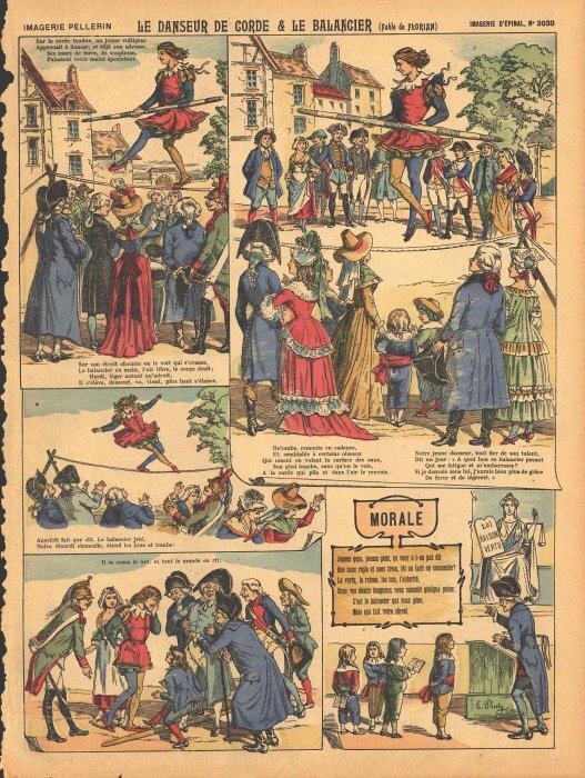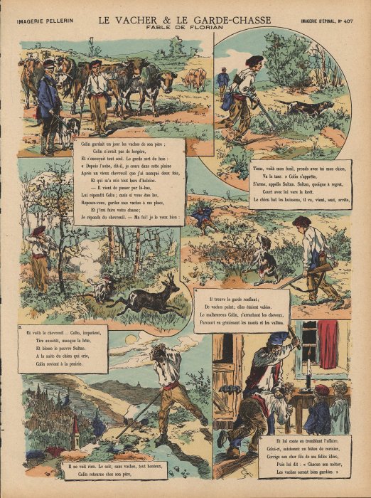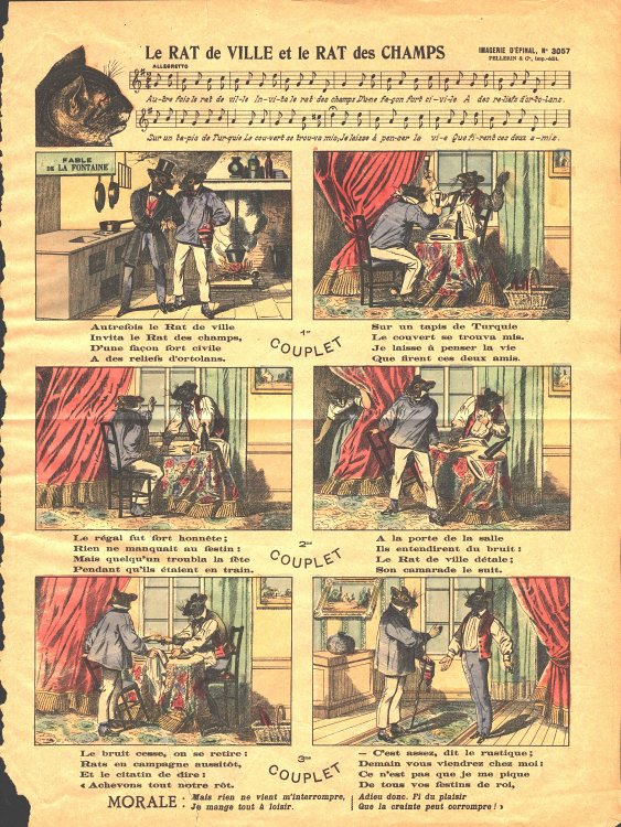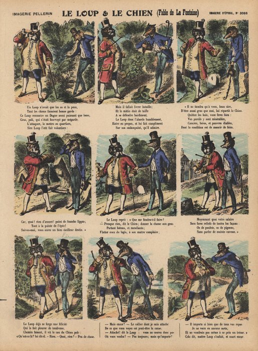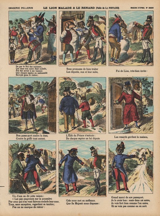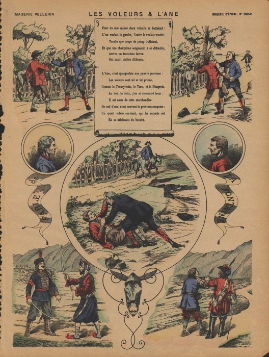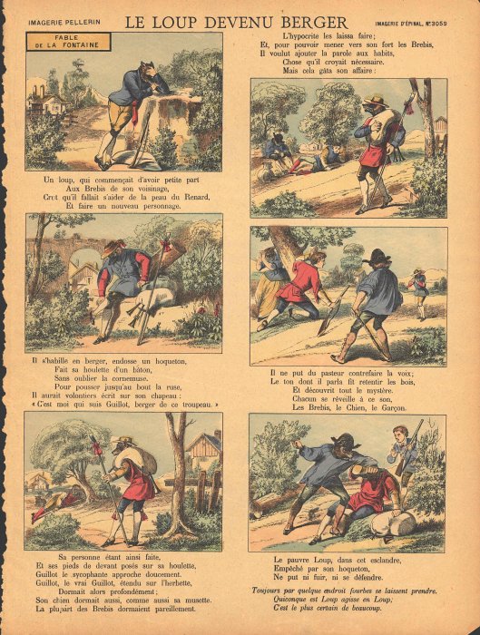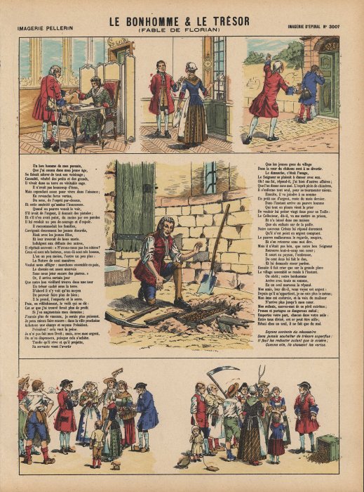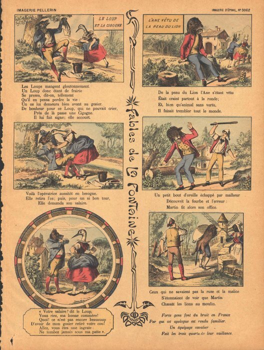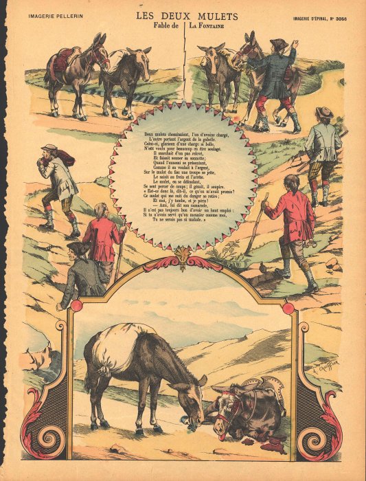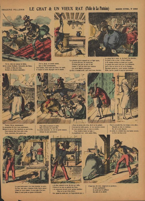 Some of these broadsides look more like pages torn from a book, and one can find those Pellerin books scattered through the collection. Several are duplicates bought in different groups. As with the illustrations in earlier Pellerin book publications around 1910, each broadside here is numbered either between 400 and 455 or between 3007 and 3088. - Source
