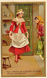 The texts do not follow La Fontaine exactly. This is the first time, I believe, that I have seen the ant dance in any form. The "Aux Deux Passages" is in Lyon and sells "nouveautés." Though I presume that there are six or seven cards in the set, these two complement each other nicely. In the first scene, the cicada approaches the ant; in the second scene, the ant dismisses the cicada. The artist here works with a very traditional approach to the fable: young woman visits matron. I find the artistry very good. The folds of the "cicada" skirt in the first picture, and the vigor of the dance (and the rejection) is telling in the second.