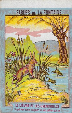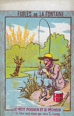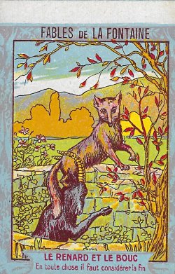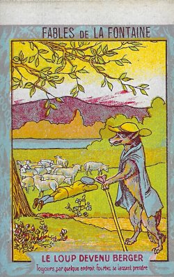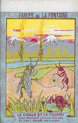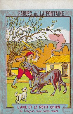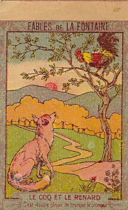 1915? 7 of 8 "Fables of La Fontaine" trade cards. Printed by Ch. Duffit, Paris. One extra of GA. All eight cards from Bertrand Cocq, Calonne Ricouart, France: the first for $6 in March of '01 and the further seven for $6 each in Sept., '20.