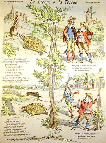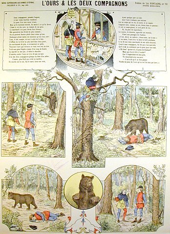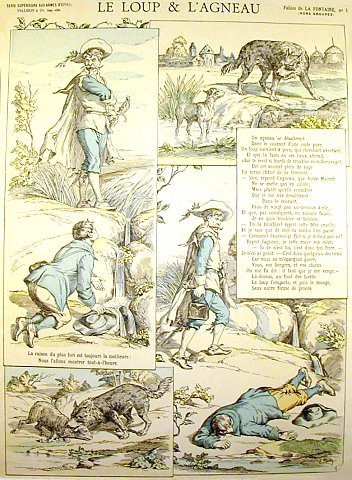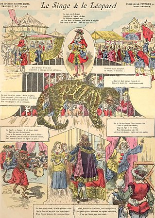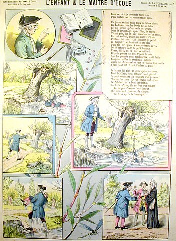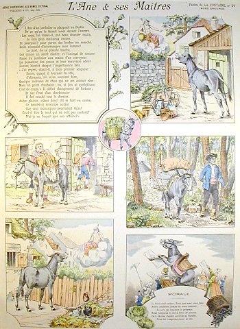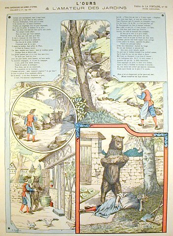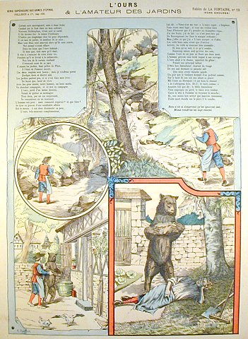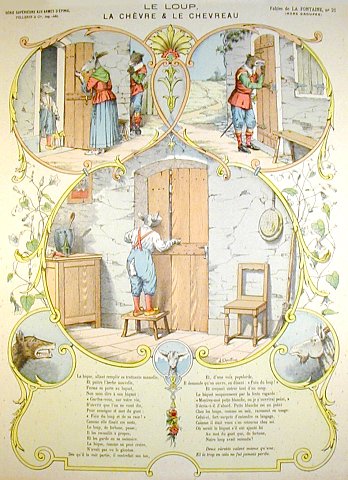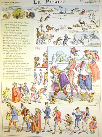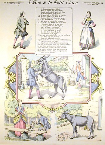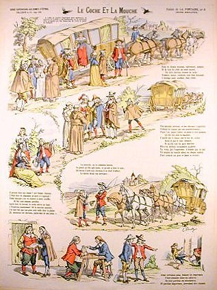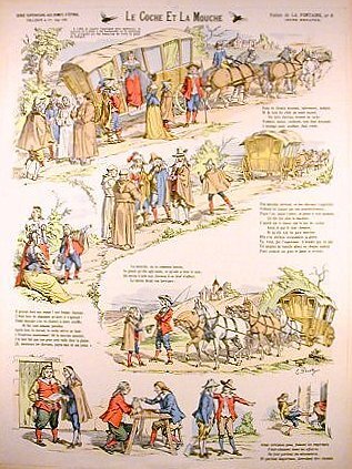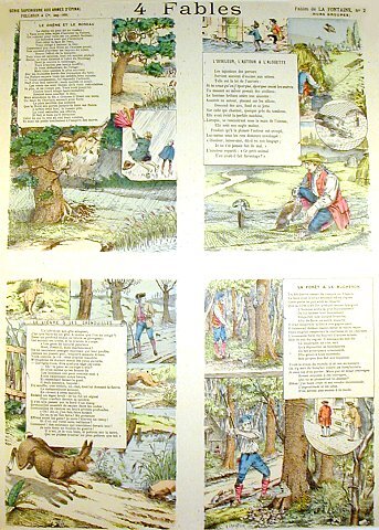 I had long thought that Pellerin, whose beautiful printing work I had seen elsewhere, must have done a set of fables. What a great surprise to find them! On almost all, the color work is still lively; on several it is brilliant, especially MSA (#8), "Le Coche et la Mouche" (#9), "L'Oeil du Maitre" (# 10), and "La Besace" (#22). Each page includes a title at the top. Somewhere on the page, the text of the fable appears. The first, WL, is bleached, perhaps from standing out at the front of the group too long under the Paris sun! - Source