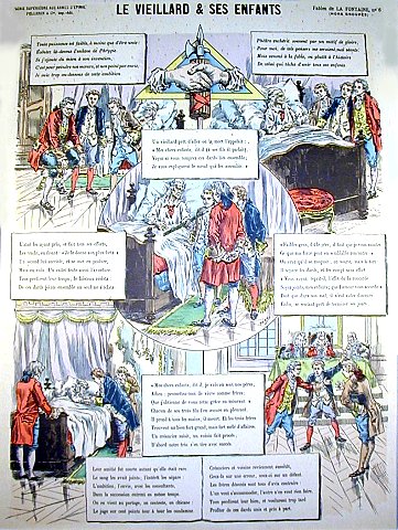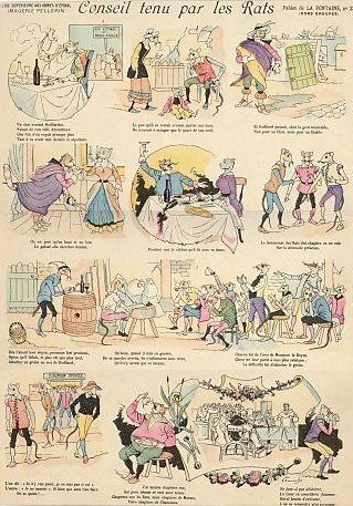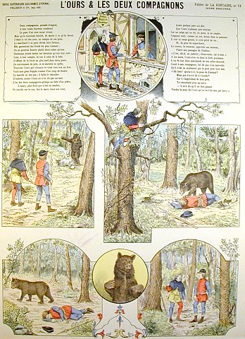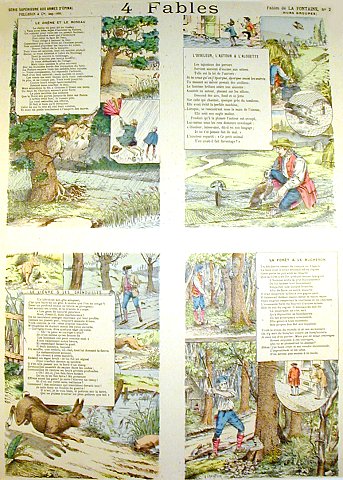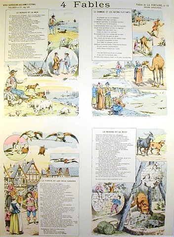 1890? Twenty-two printed sheets, 12½" x 16¼", each featuring either an individual fable of La Fontaine or a set of four fables. Each is numbered in an apparent set of 25. Now I have found the whole set of 25 gathered in a book, Fables de la Fontaine, for which I have guessed a date of the same year. Matted on white cardboard. Missing are #3, #7, and #20. There is one extra copy of #14. Each is marked "Série Supérieure aux Armes d'Épinal, Pellerin & Cie, imp. -édit." and "Fables de LA FONTAINE (Hors Groupes)." I bought 21 of them as a group from a Buchinist along the Seine, August, '99; individually they were priced between 70 and 120 Francs each, but we settled on a group price of 1150 Francs for the twenty-one. I found two others at another Buchinist stall just a few minutes later and paid 75 Francs each for them. Click on any image to see it enlarged.